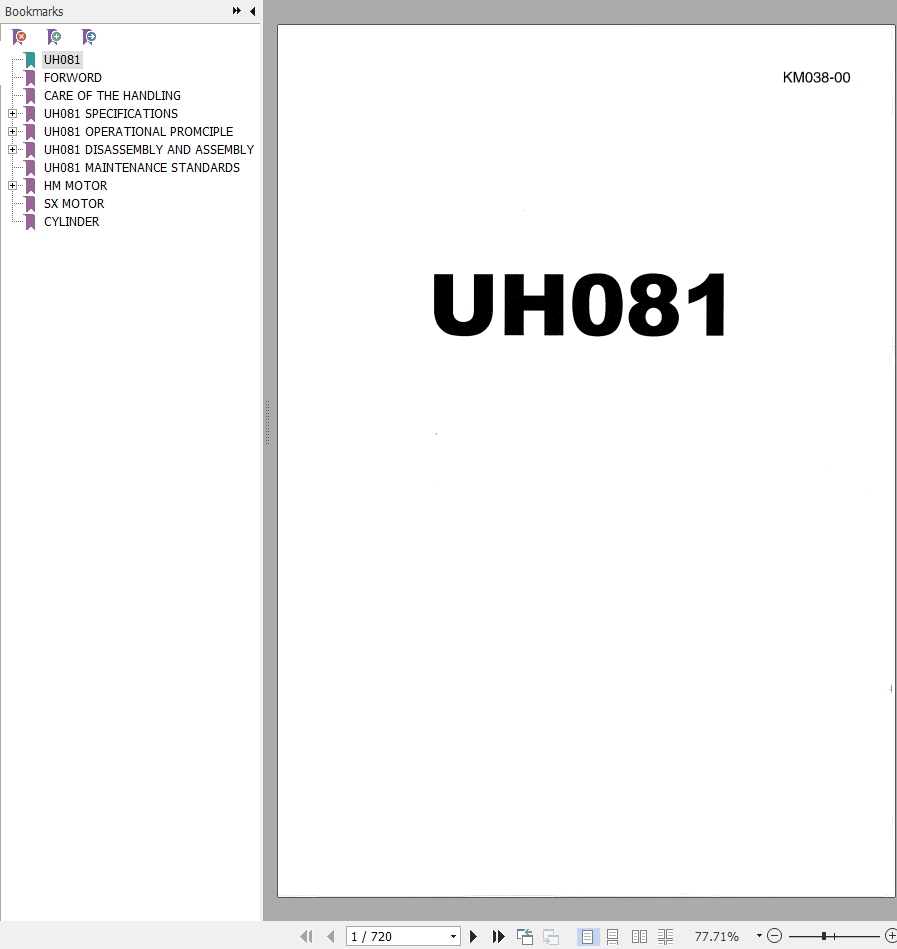Hitachi UH081 Service Manual KM038-00Size: 106.8 MBMachine: ExcavatorMachine Model: UH081Page: 720 PagesPart Number: KM038-00
