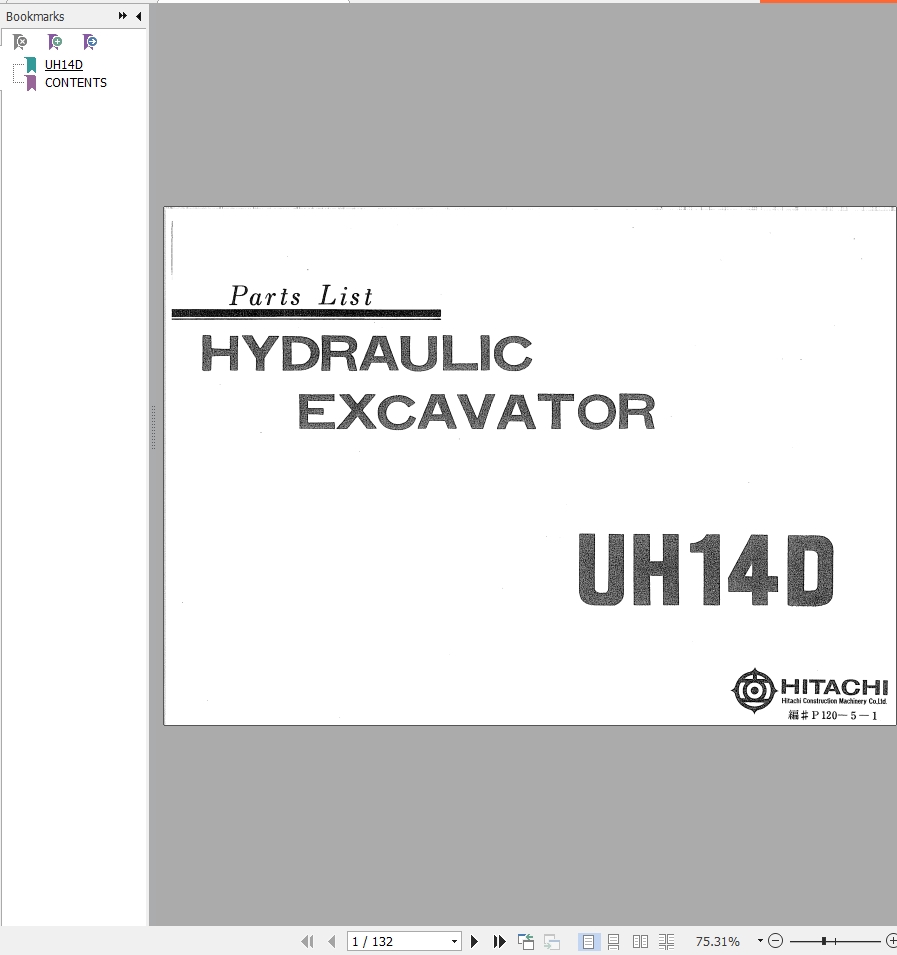 Hitachi UH14D Parts List P120-5-1Size: 6.0 MBMachine: ExcavatorMachine Model: UH14DPage: 132 PagesPart Number: P120-5-1