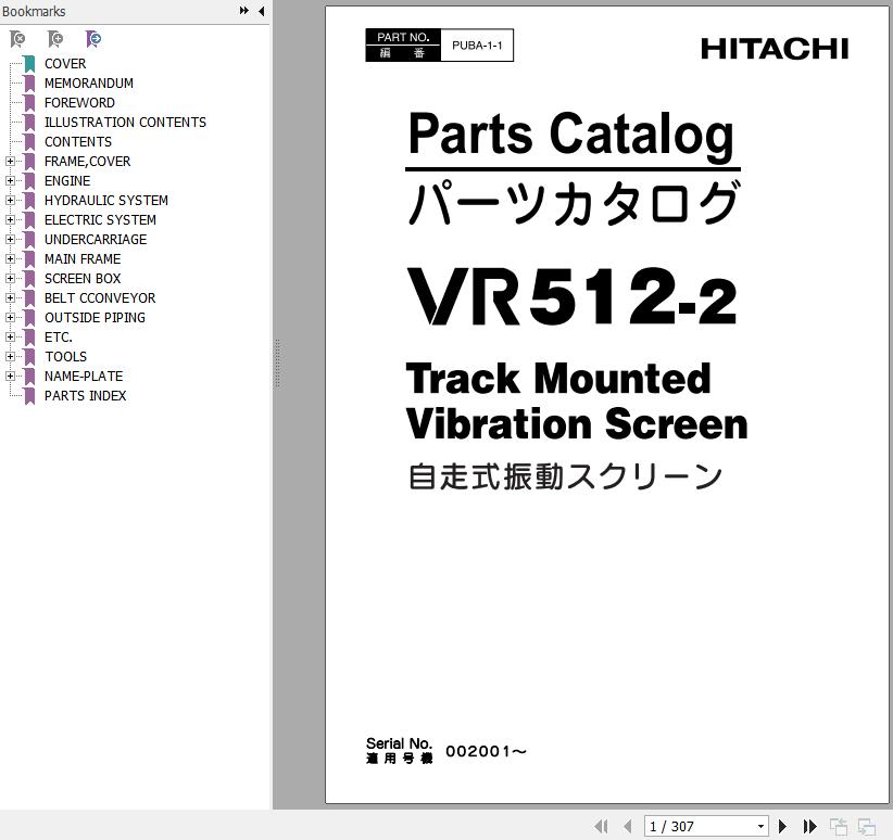 Hitachi VR512-2 Track Mounted Vibration Screen Parts Catalog PUBA-1-1 EN JP 307 Pages 2010