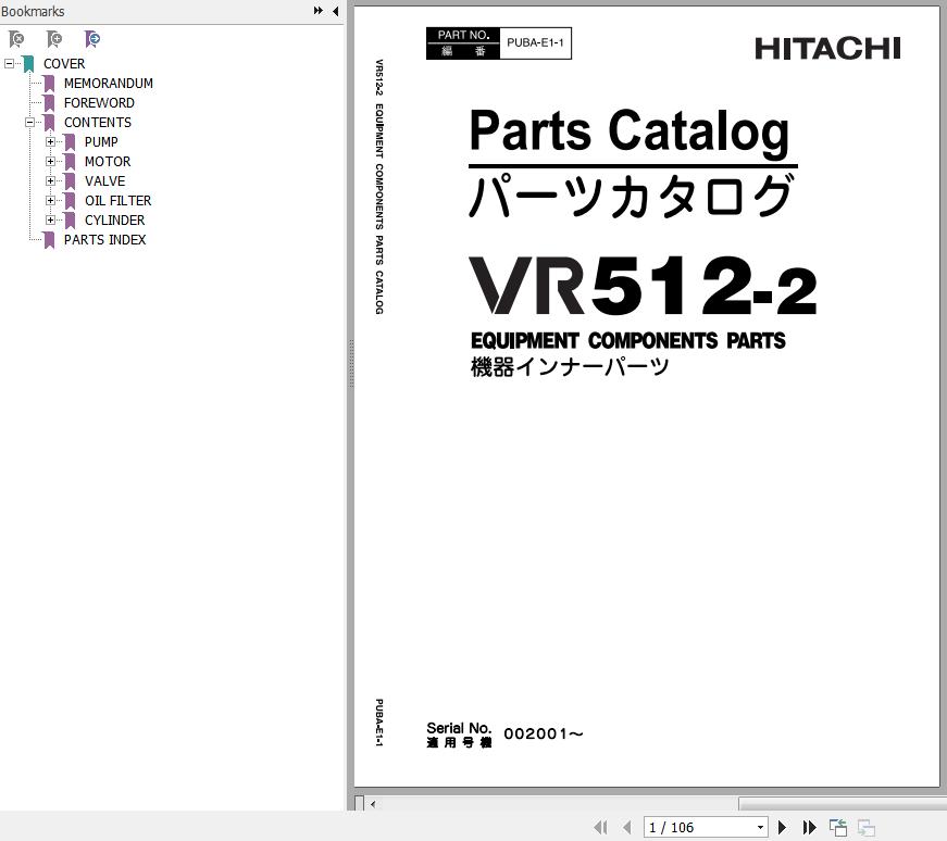 Hitachi VR512-2 Equipment Components Parts Catalog PUBA-E1-1 EN JP 106 Pages 2010