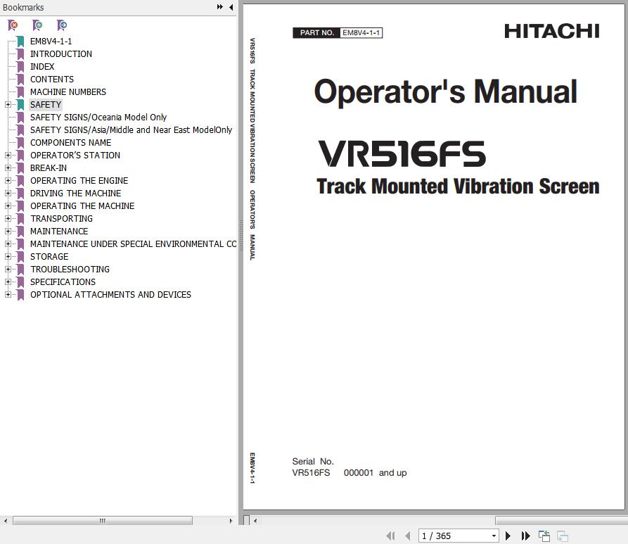 Hitachi VR516FS Track Mounted Vibration Screen Operator's Manual EM8V4-1-1