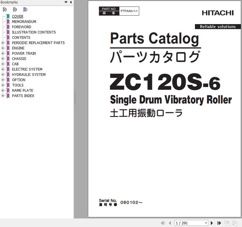 Hitachi ZC120S-6 Single Drum Vibratory Roller Parts Catalog PTFAA0-1-1
