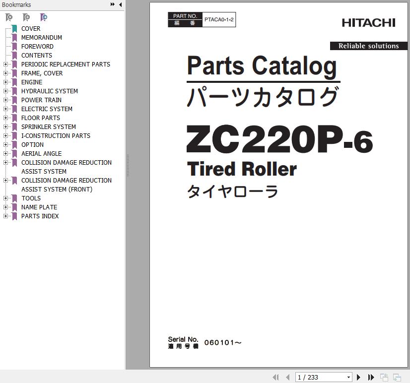 The Bookmarks of Hitachi ZC220P-6 Tired Roller Parts Catalog: