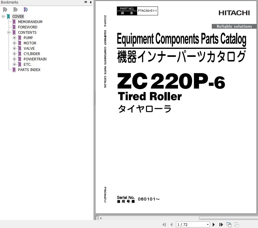Hitachi ZC220P-6 Tired Roller Equipment Components Parts Catalog PTACA0-E1-1 EN JP 72 Pages 2017