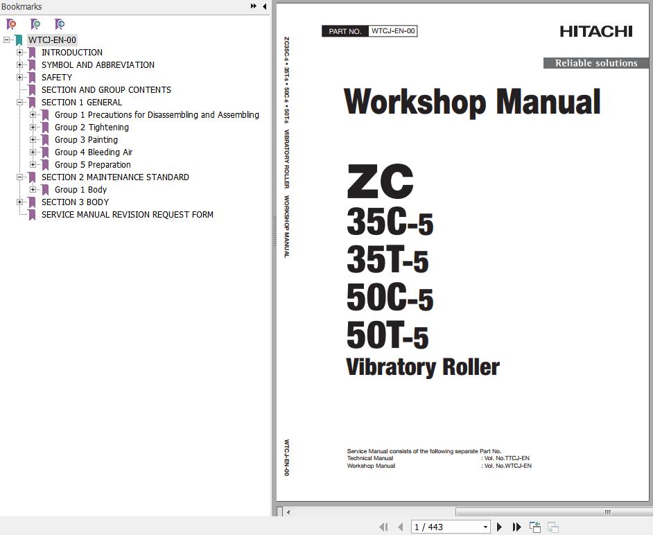 Hitachi ZC35C-5 ZC35T-5 ZC50C-5 ZC50T-5 Vibratory Roller Workshop Manual WTCJ-EN-00