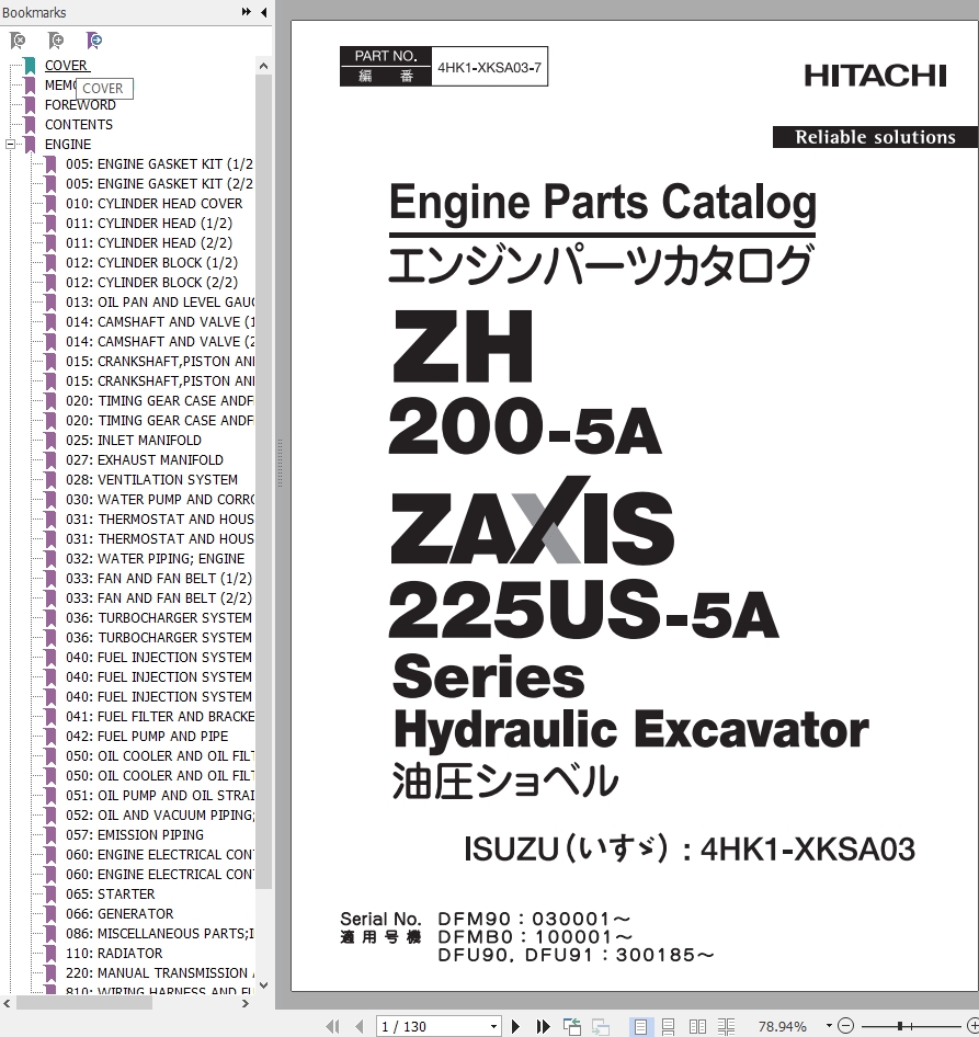 Hitachi ZH200-5A ZX225US-5A Engine Parts Catalog 4HK1-XKSA03-7