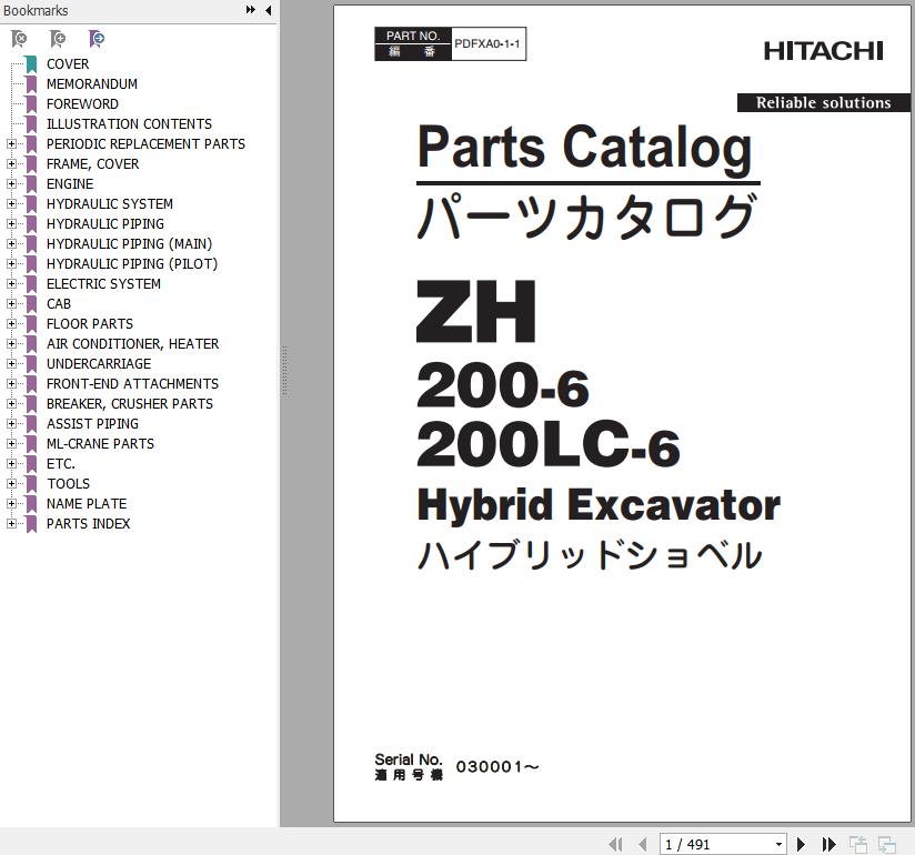 Hitachi ZH200-6 ZH200LC-6 Parts Catalog PDFXA0-1-1 EN JP 491 Pages 2017