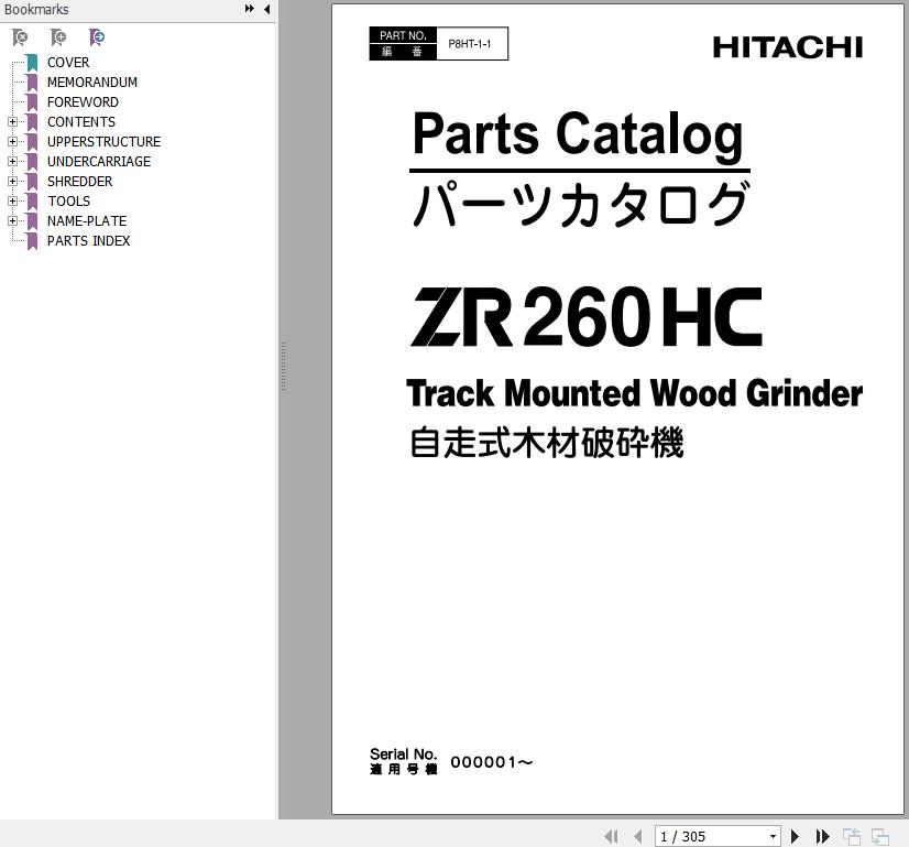 Hitachi ZR260HC Track Mounted Wood Grinder Parts Catalog P8HT-1-1 EN JP 305 Pages 2007