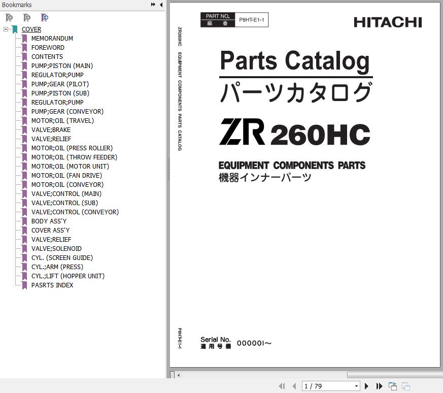Hitachi ZR260HC Equipment Components Parts Catalog P8HT-E1-1 EN JP 79 Pages 2007