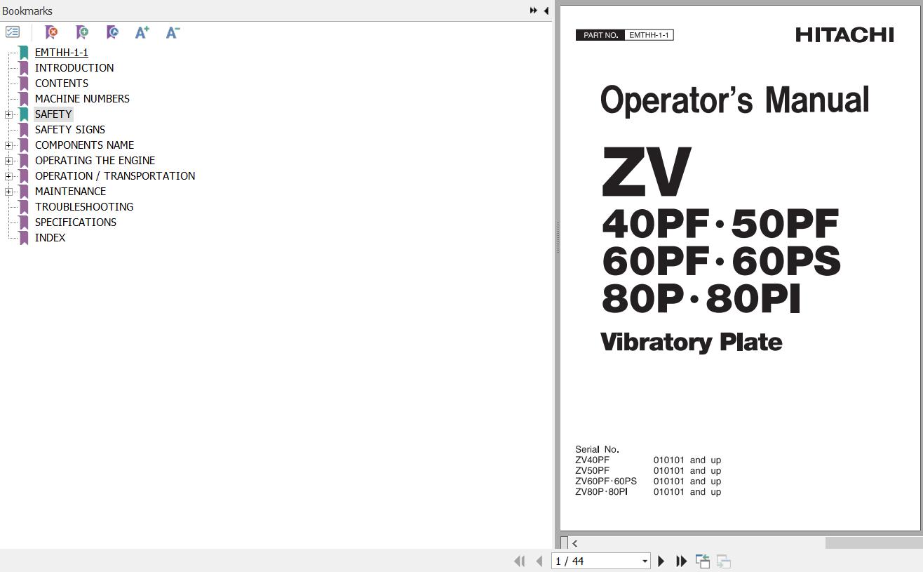 Hitachi ZV40PF to ZV80PI Operator’s Manual EMTHH-1-1