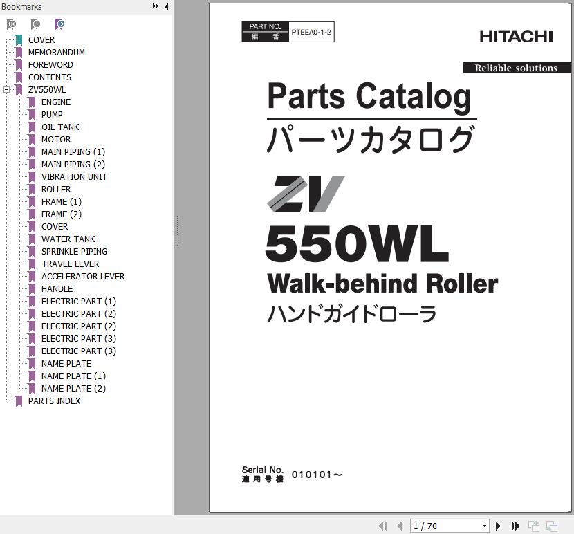 Hitachi ZV550WL Walk-behind Roller Parts Catalog PTEEA0-1-2 EN JP 70 Pages 2017
