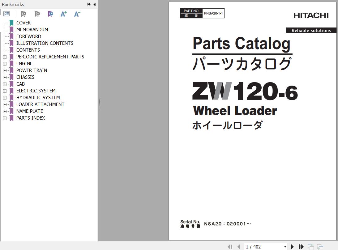 Hitachi ZW120-6 Parts Catalog PNSA20-1-1 EN JP 402 Pages 2023