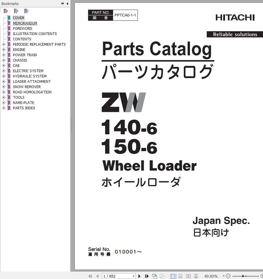 Hitachi ZW150-6 ZW140-6 Parts Catalog PPTCA0-1-1