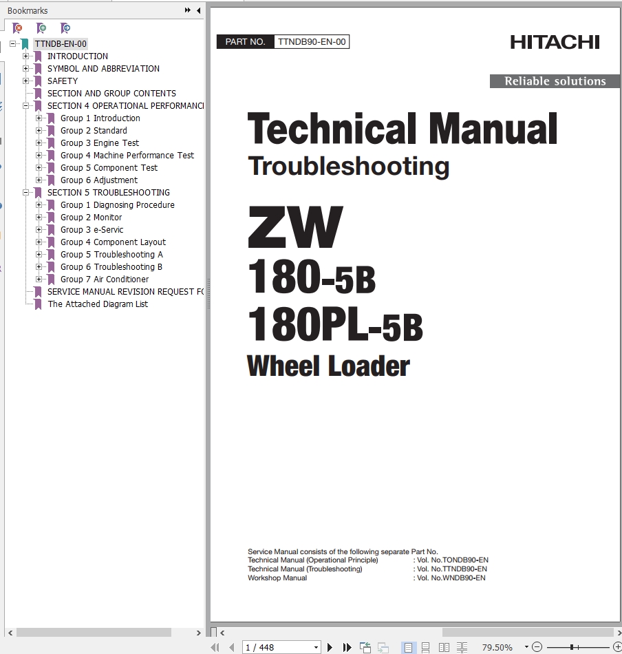 Hitachi ZW180-5B ZW180PL-5B Technical Manual TTNDB90-EN-00 448 Pages