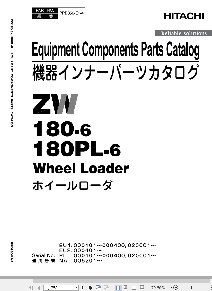 Hitachi ZW180-6 ZW180PL-6 Parts Catalog PPD850-E1-4