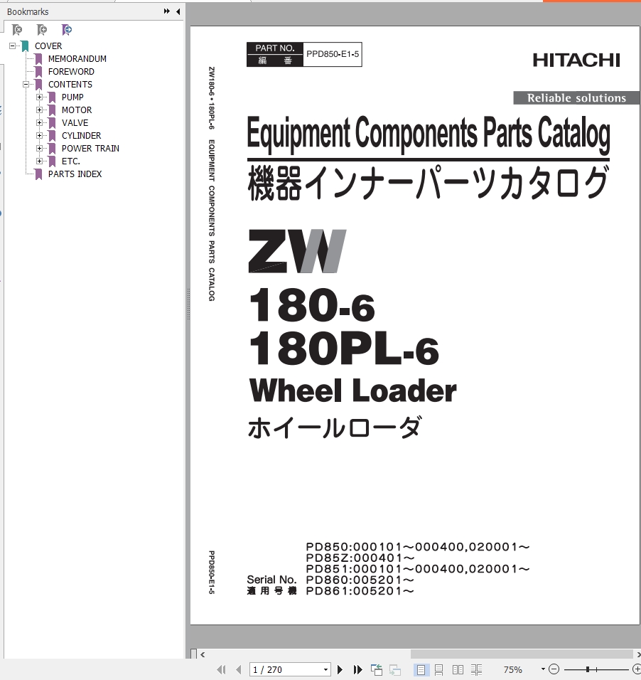 Hitachi ZW180-6 ZW180PL-6 Parts Catalog PPD850-E1-5