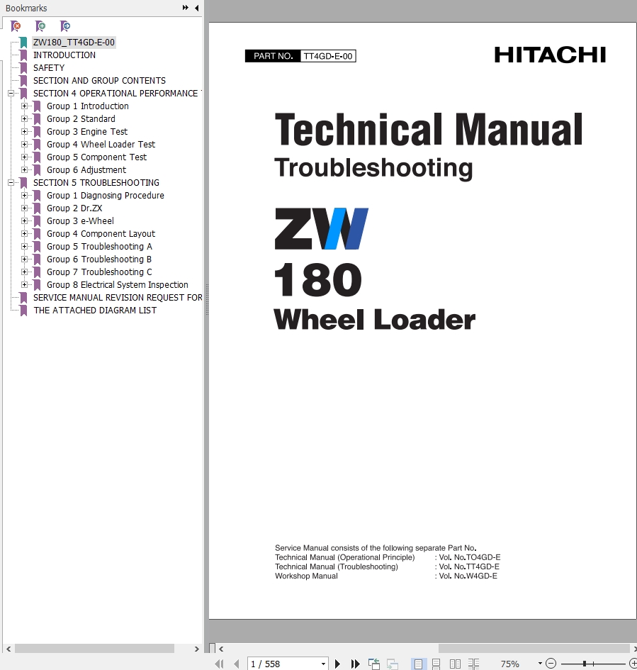 The Bookmarks of Hitachi ZW180 Wheel Loader Technical Manual(Troubleshooting):