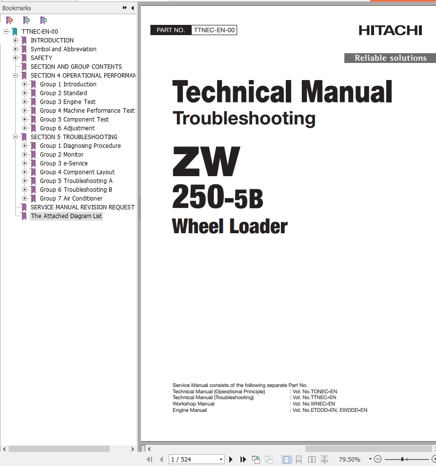 The Bookmarks of Hitachi ZW250-5B Wheel Loader Technical Manual(Troubleshooting):