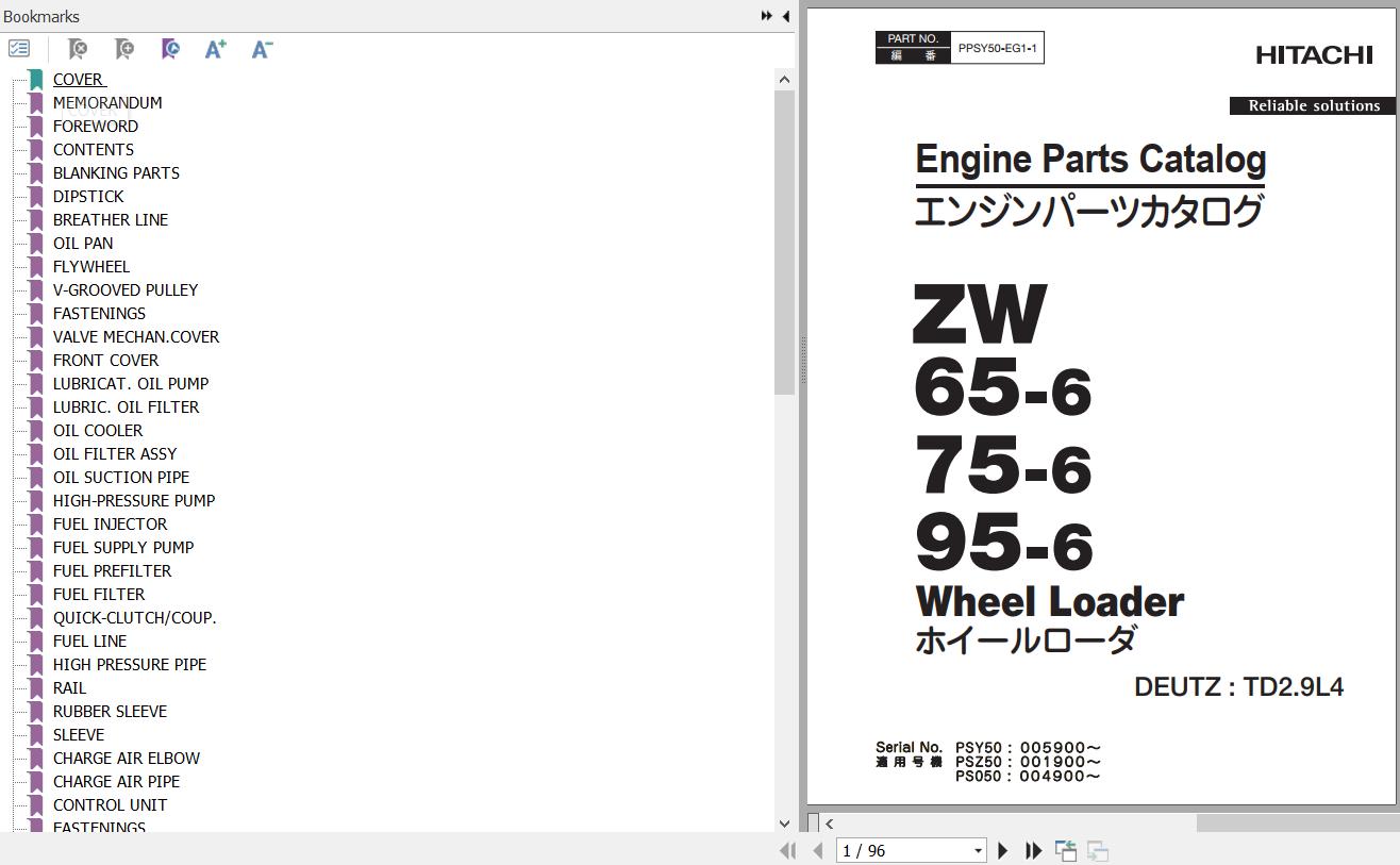 Hitachi ZW65-6 75-6 95-6 Deutz TD2.9L4 Engine Parts Catalog PPSY50-EG1-1