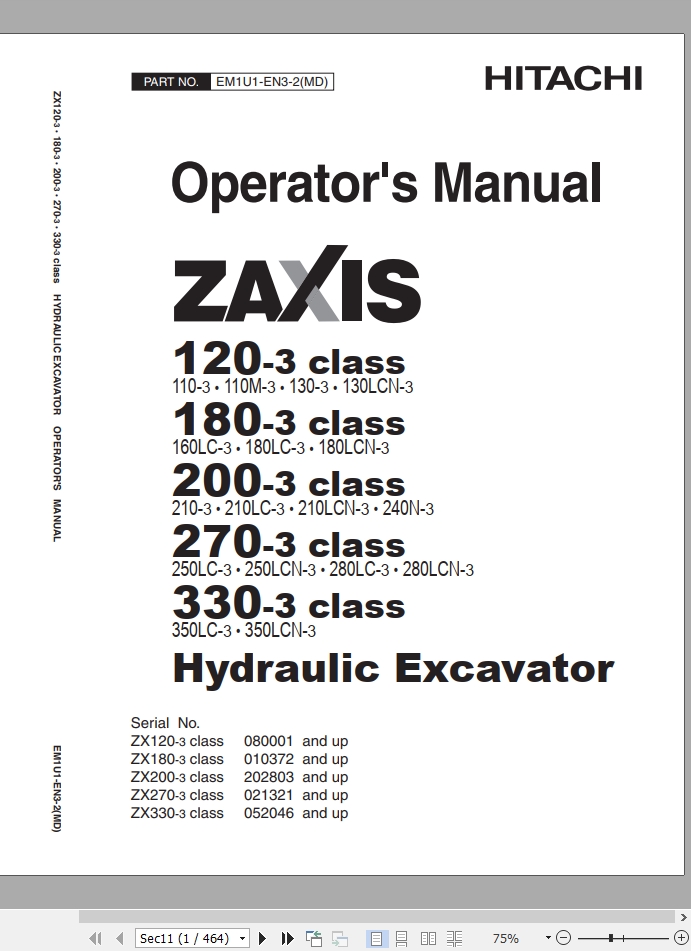 Hitachi ZX120-3 ZX180-3 ZX200-3 ZX270-3 ZX330-3 Class Operator's Manual EM1U1-EN3-2(MD)