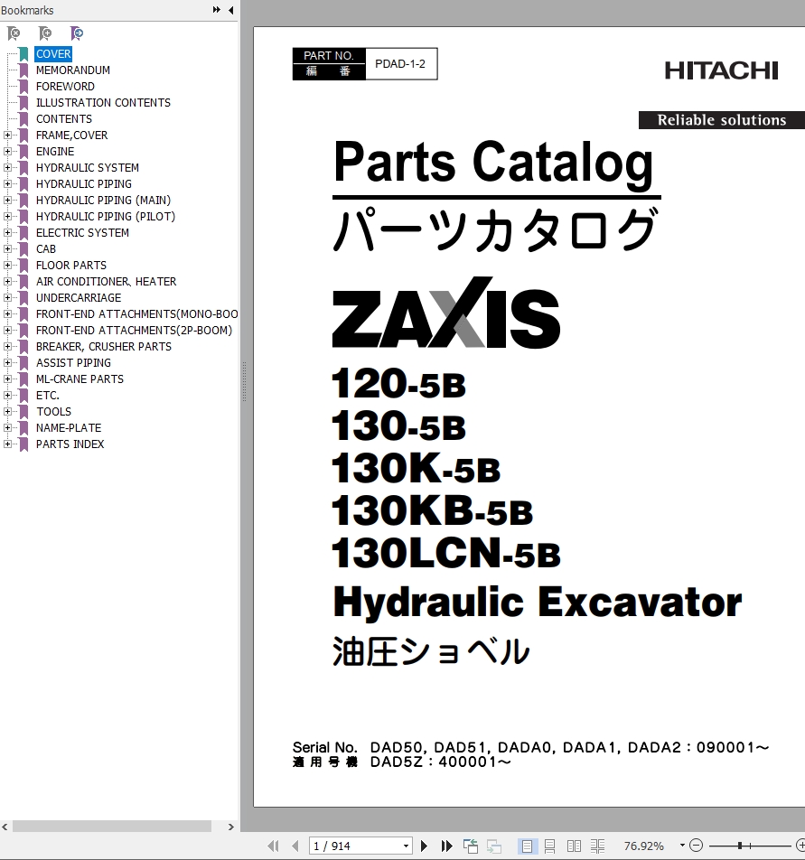 Hitachi ZX120-5B ZX130-5B ZX130K-5B ZX130KB-5B ZX130LCN-5B Parts Catalog PDAD-1-2