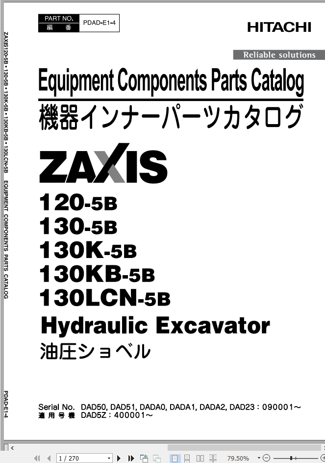 Hitachi ZX120-5B ZX130-5B ZX130K-5B ZX130KB-5B ZX130LCN-5B Parts Catalog PDAD-E1-4