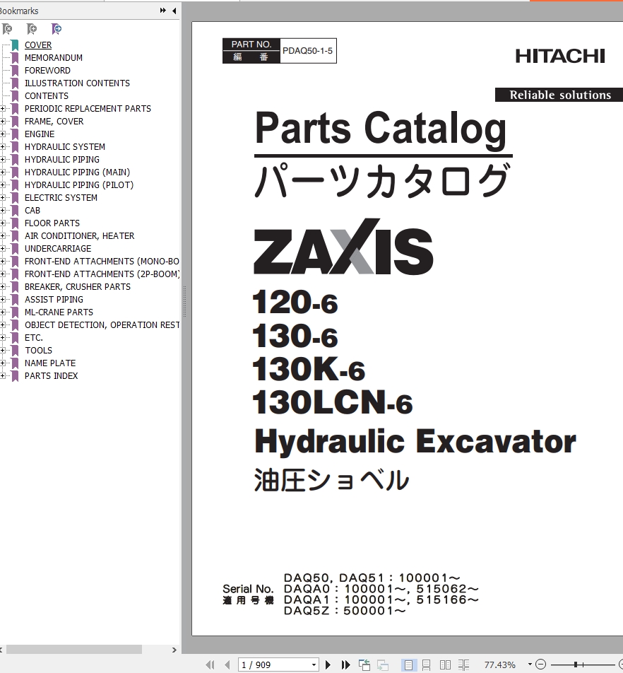 Hitachi ZX120-6 ZX130-6 ZX130K-6 ZX130LCN-6 Parts Catalog PDAQ50-1-5