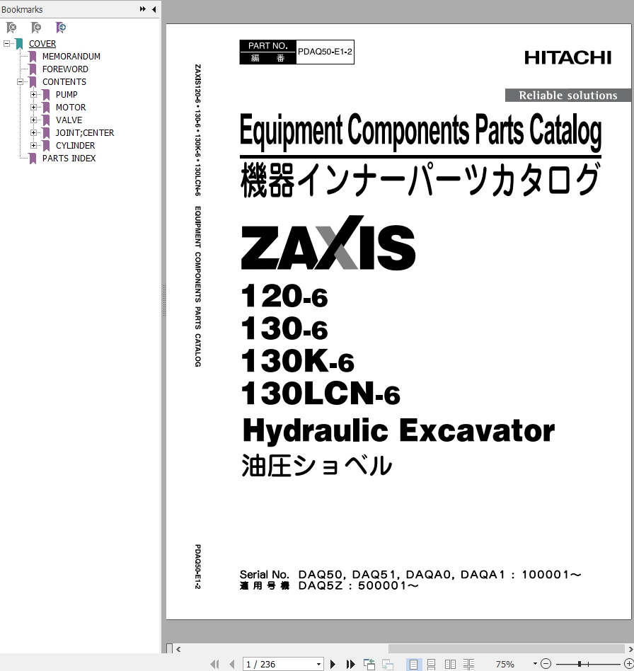 Hitachi ZX120-6 ZX130-6 ZX130K-6 ZX130LCN-6 Parts Catalog PDAQ50-E1-2