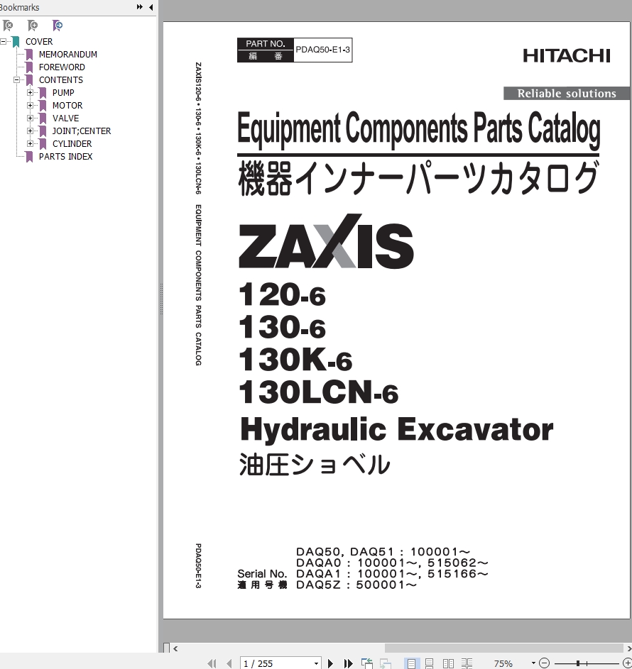 Hitachi ZX120-6 ZX130-6 ZX130K-6 ZX130LCN-6 Parts Catalog PDAQ50-E1-3
