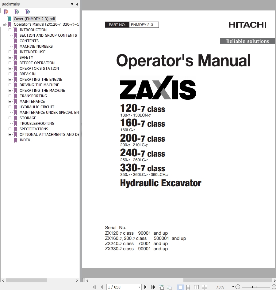 Hitachi ZX120-7 ZX330-7 Class Operator's Manual ENMDFY-2-3