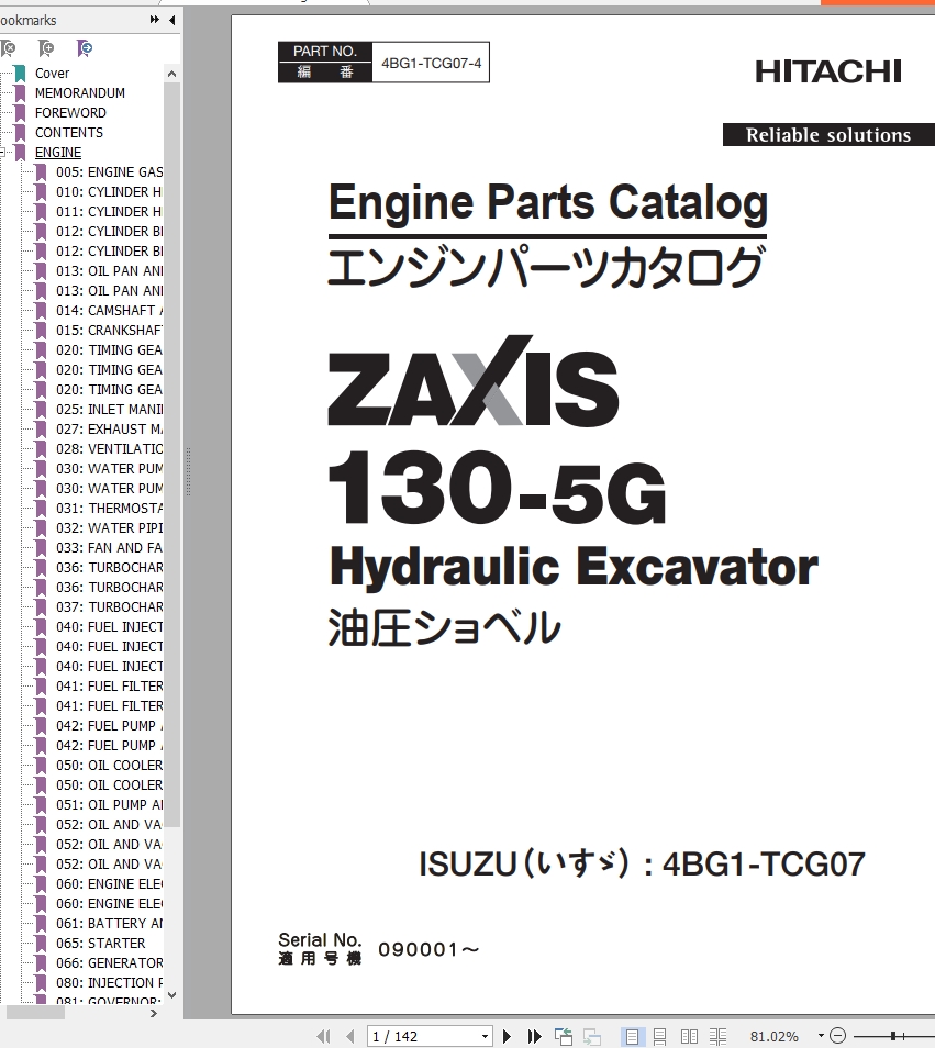 Hitachi ZX130-5G Engine Parts Catalog 4BG1-TCG07-4