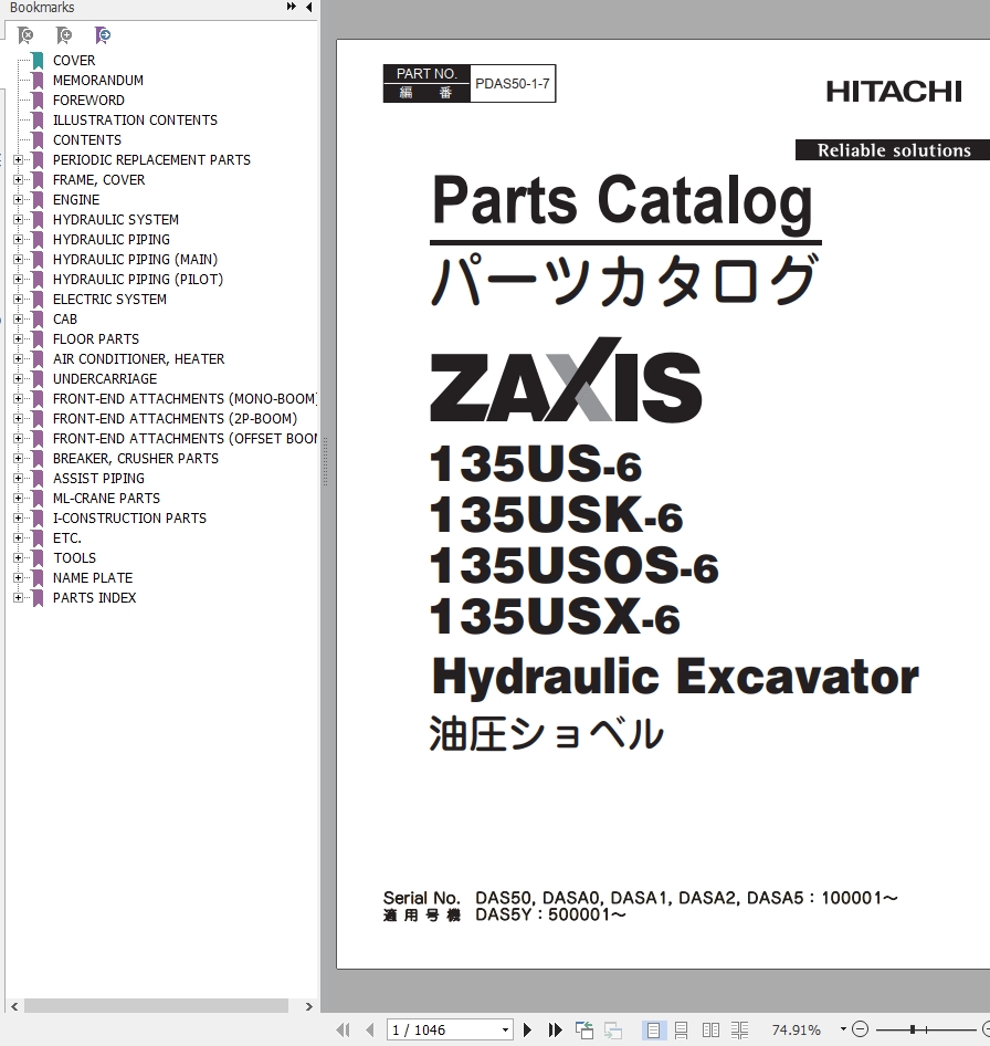 Hitachi ZX135US-6 ZX135USK-6 ZX135USOS-6 ZX135USX-6 Parts Catalog PDAS50-1-7