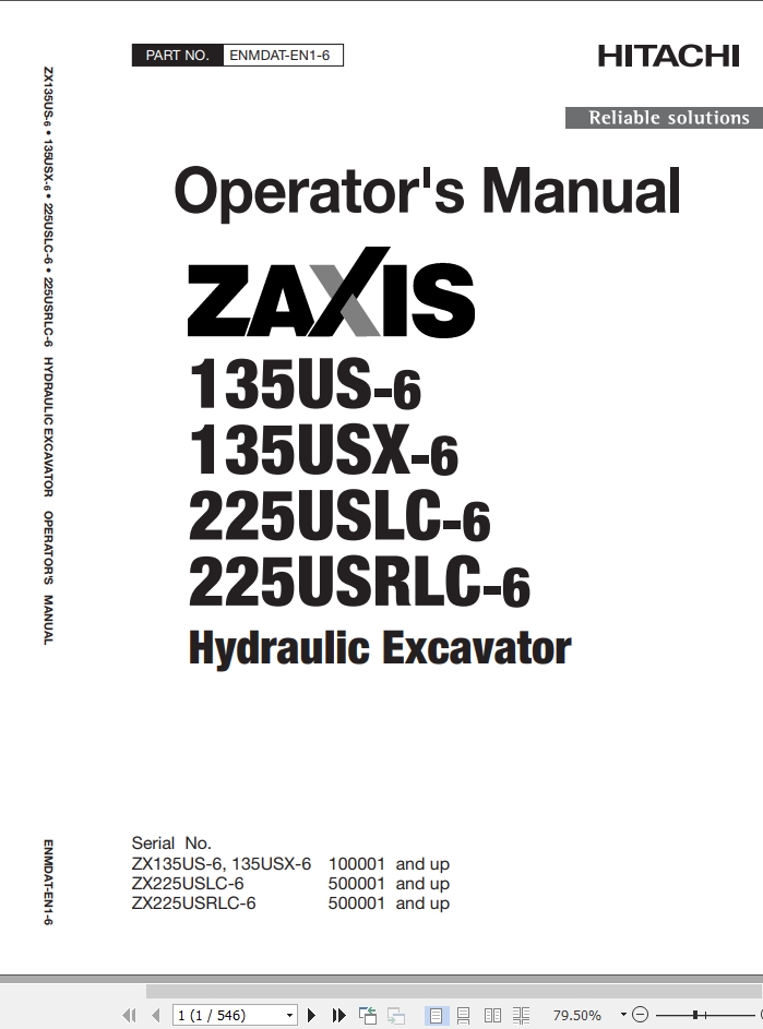 Hitachi ZX135US-6 ZX135USX-6 ZX225USLC-6 ZX225USRLC-6 Operator's Manual ENMDAT-EN1-6