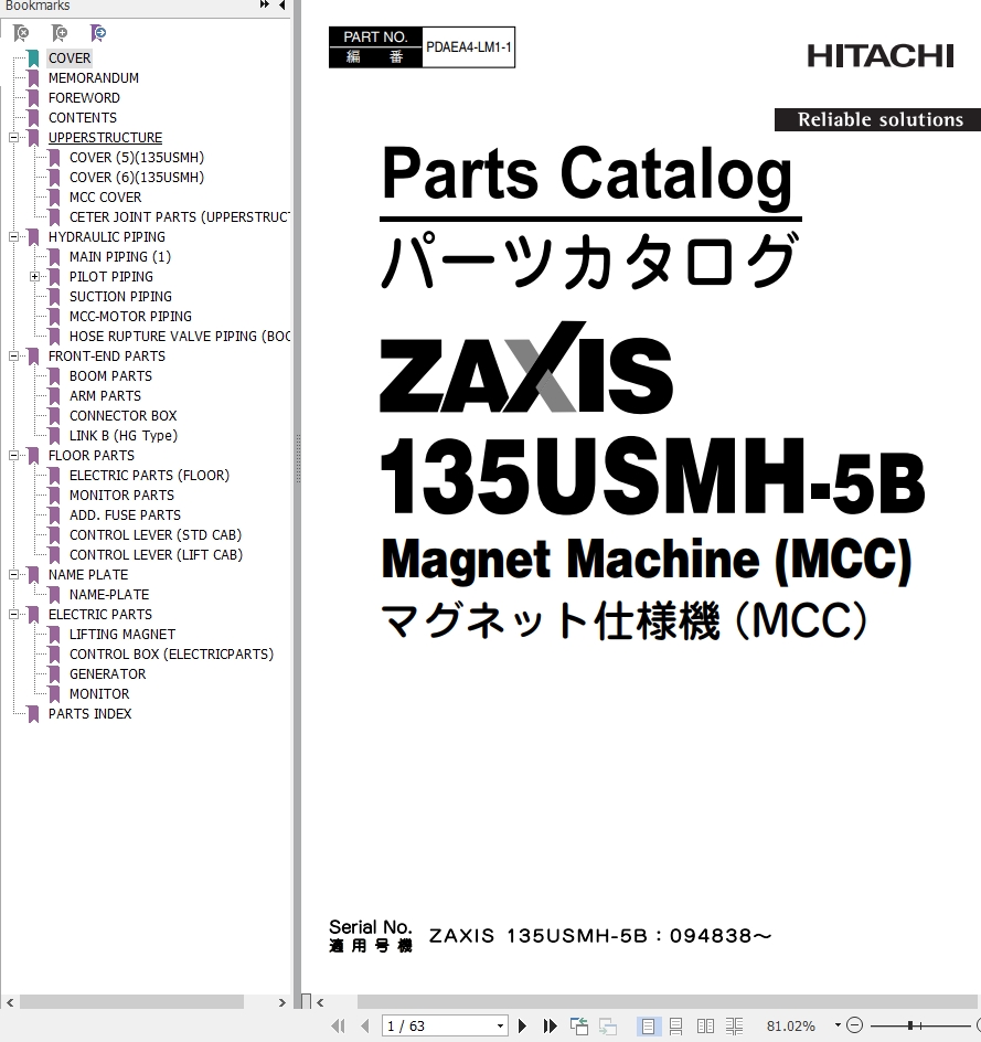 Hitachi ZX135USMH-5B Parts Catalog PDAEA4-LM1-1