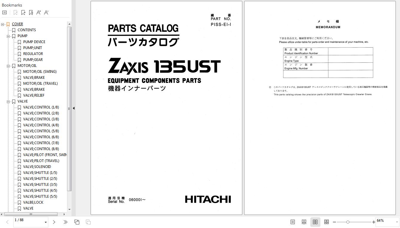 Hitachi ZX135UST Equipment Components Parts Catalog P1SS-E1-1