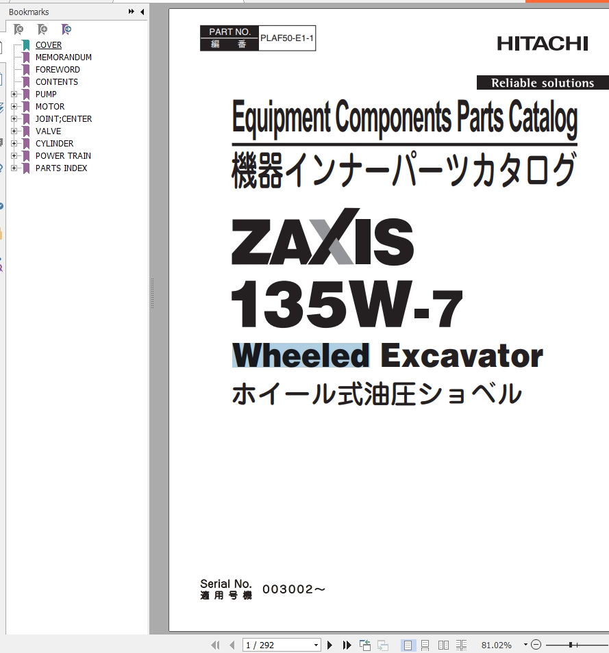 Hitachi ZX135W-7 Parts Catalog PLAF50-E1-1