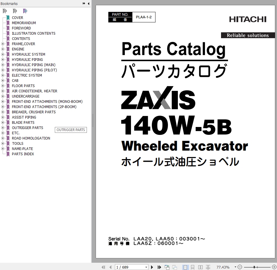 Hitachi ZX140W-5B Parts Catalog PLAA-1-2