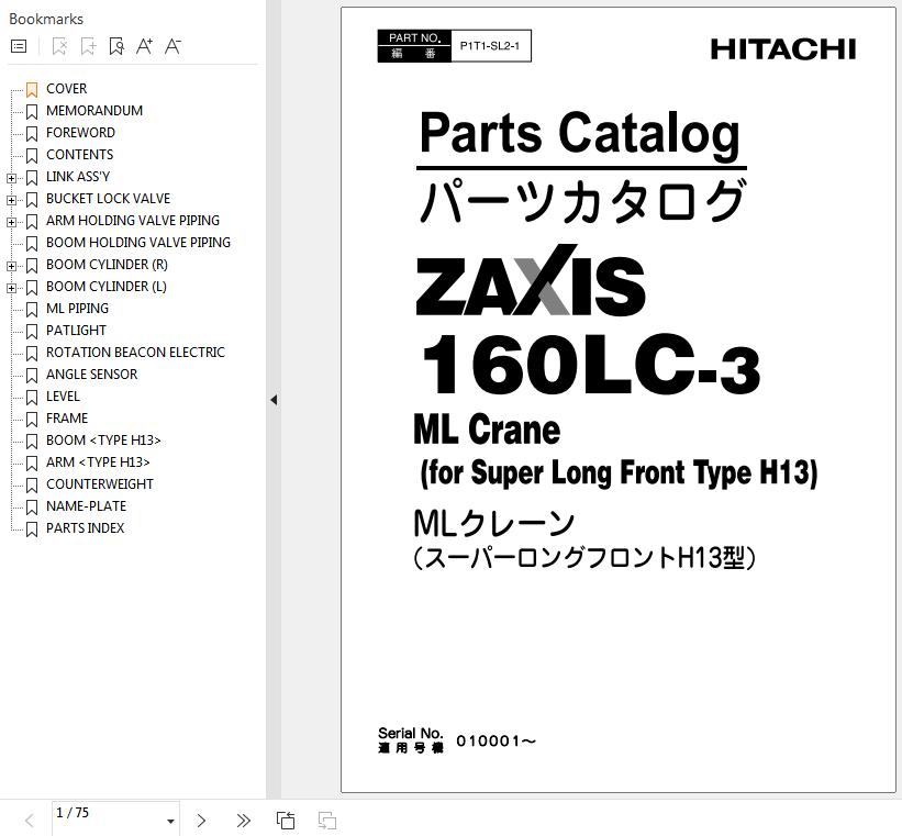 Hitachi ZX160LC-3 ML Crane Parts Catalog P1T1-SL2-1