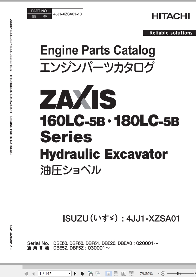 Hitachi ZX160LC-5B ZX180LC-5B Engine Parts Catalog 4JJ1-XZSA01-13