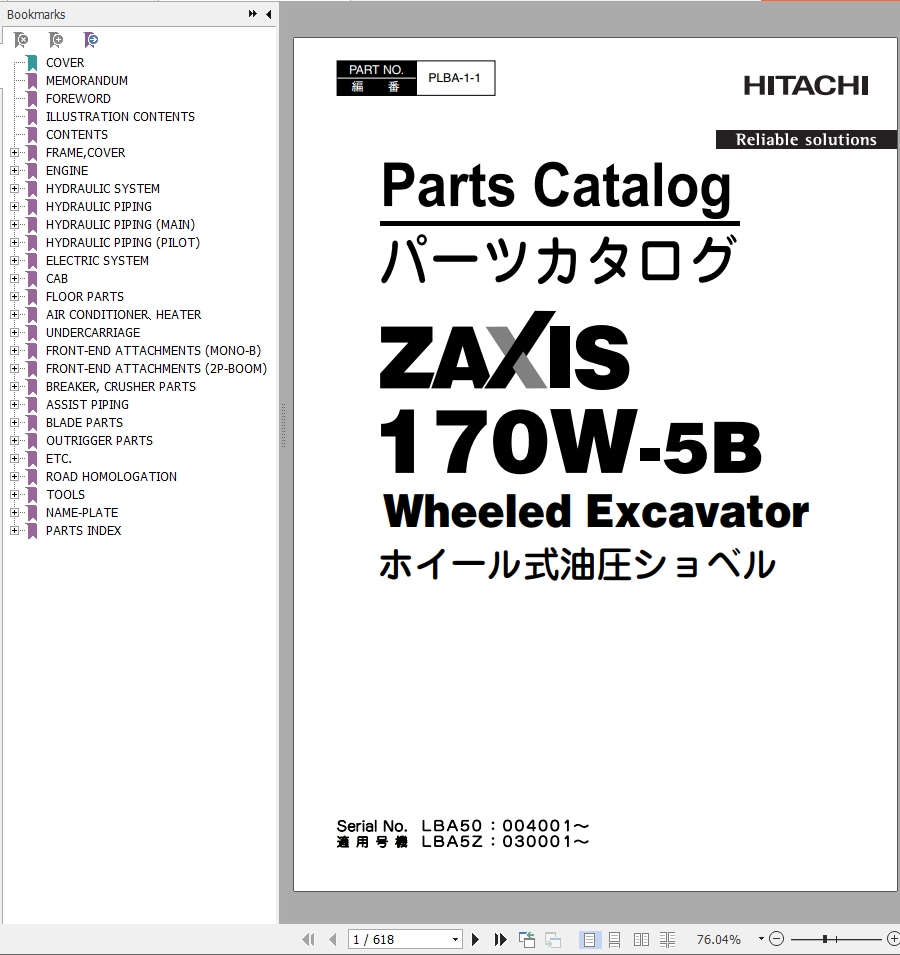 Hitachi ZX170W-5B Parts Catalog PLBA-1-1
