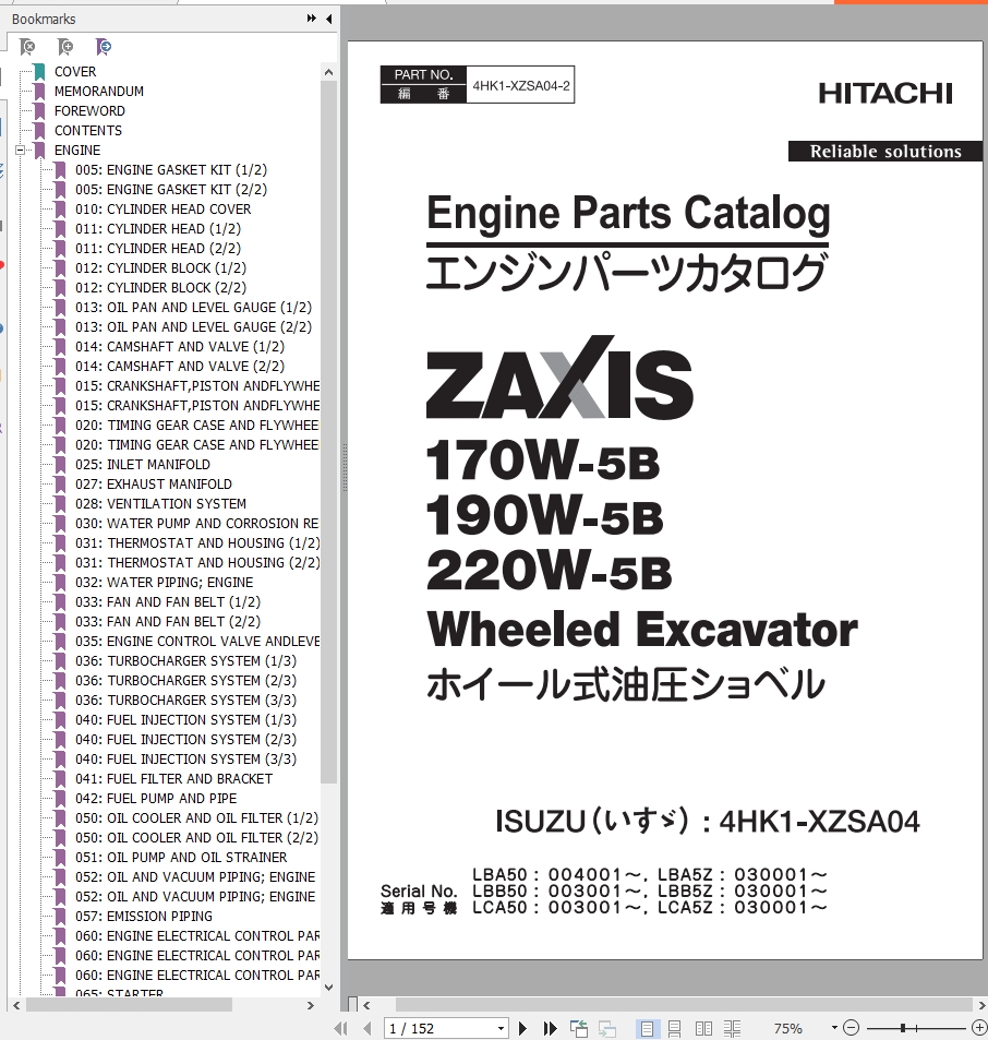 Hitachi ZX170W-5B ZX190W-5B ZX220W-5B Engine Parts Catalog 4HK1-XZSA04-2