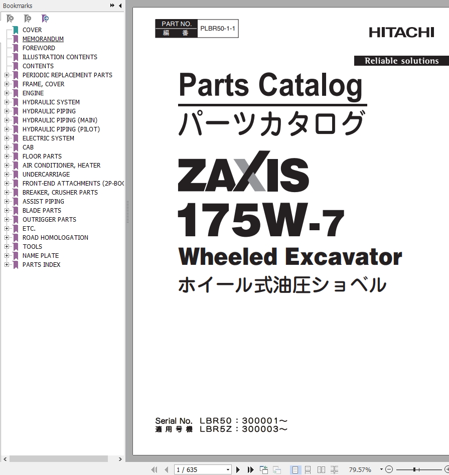 Hitachi ZX175W-7 Parts Catalog PLBR50-1-1