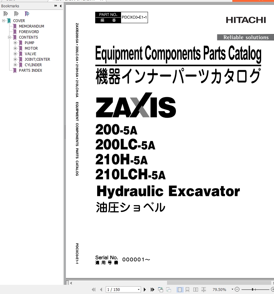 Hitachi ZX200-5A ZX200LC-5A ZX210H-5A ZX210LCH-5A Parts Catalog PDCXC0-E1-1