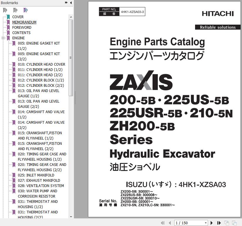 The Bookmarks of Hitachi ZX200-5B To ZX210-5N ZH200-5B Series ISUZU 4HK1-XZSA03 Engine Parts Catalog: