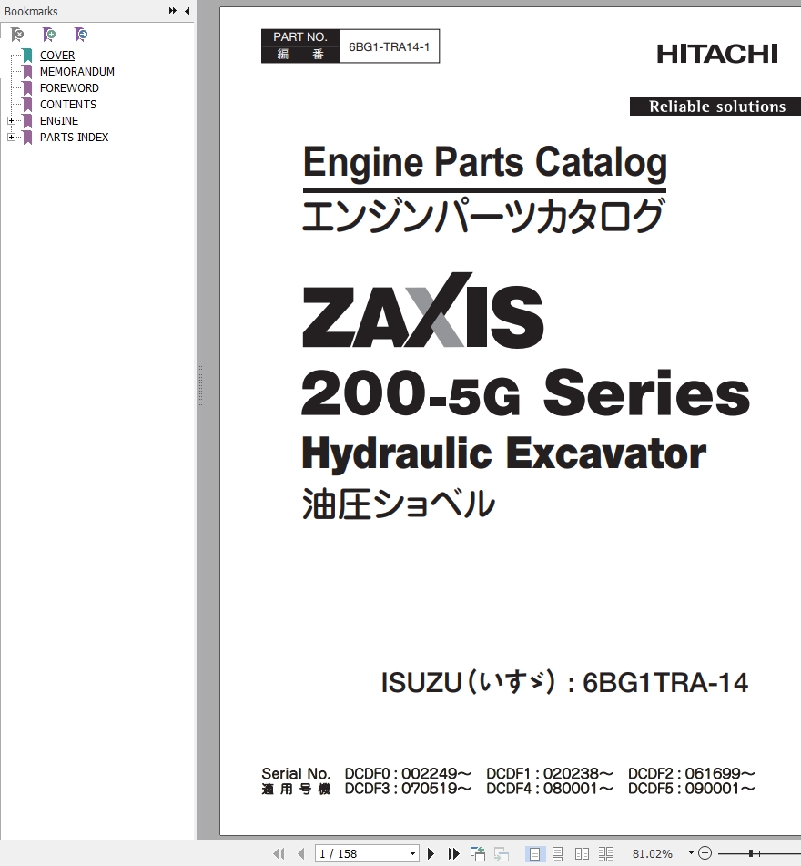 Hitachi ZX200-5G Series Engine Parts Catalog 6BG1-TRA14-1