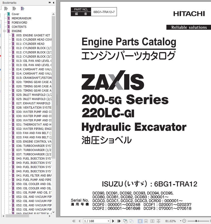Hitachi ZX200-5G ZX220LC-GL Engine Parts Catalog 6BG1-TRA12-7