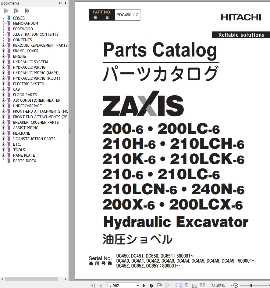 Hitachi ZX200-6 ZX200LCX-6 Parts Catalog PDC450-1-2