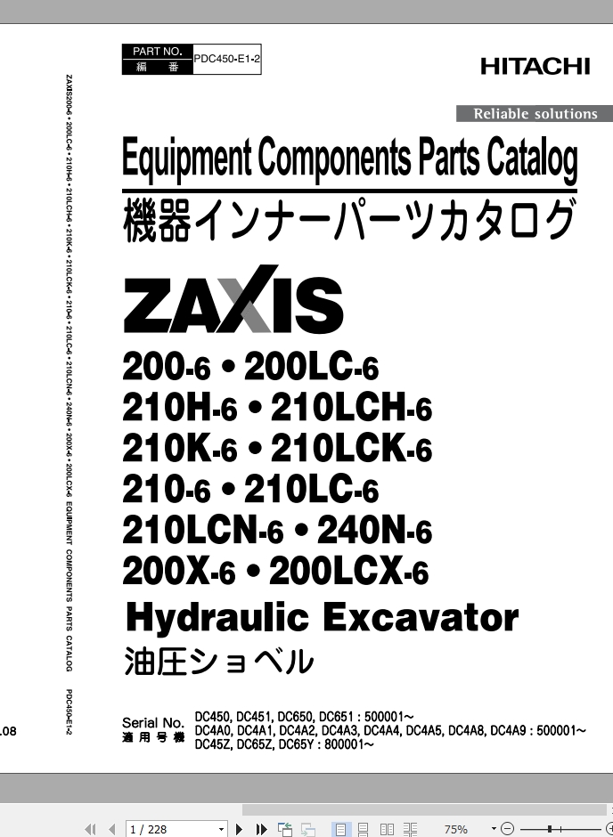 Hitachi ZX200-6 ZX200LCX-6 Parts Catalog PDC450-E1-2