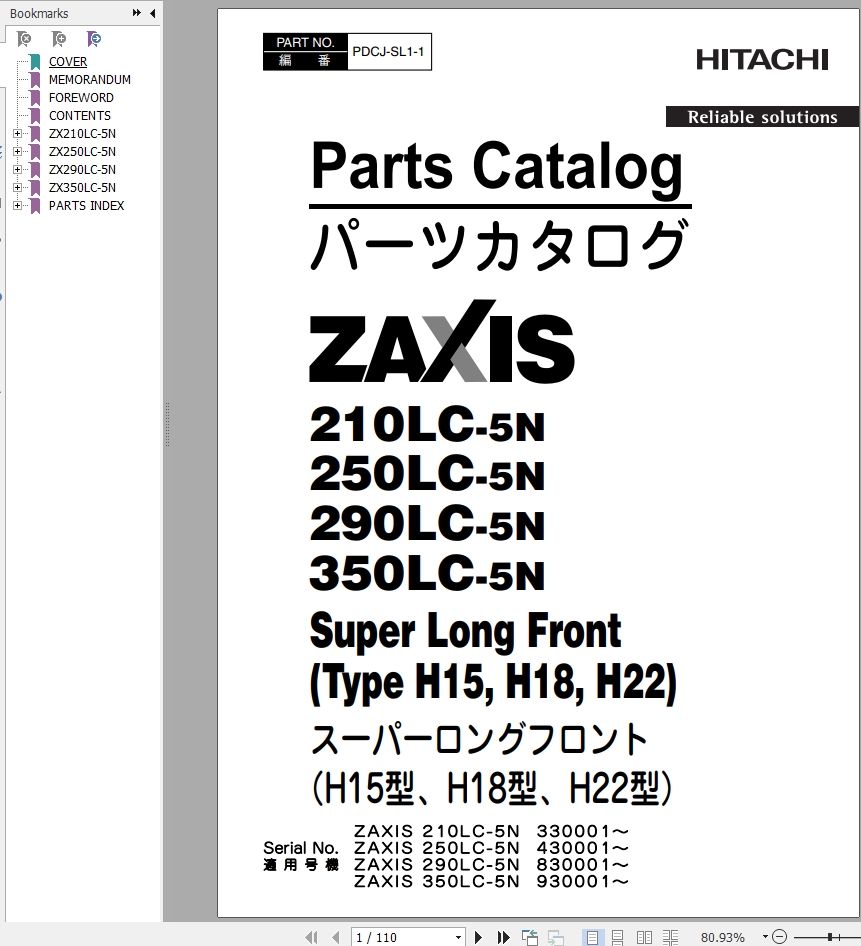 Hitachi ZX210LC-5N ZX250LC-5N ZX290LC-5N ZX350LC-5N Parts Catalog PDCJ-SL1-1