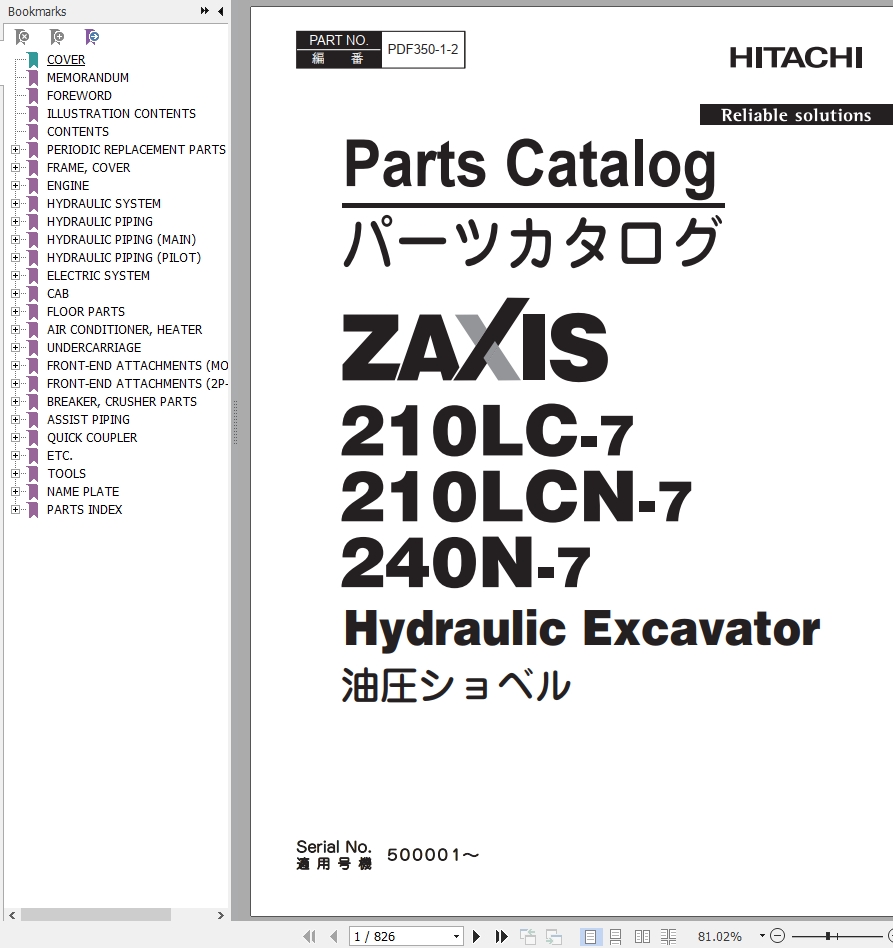 Hitachi ZX210LC-7 ZX210LCN-7 ZX240N-7 Parts Catalog PDF350-1-2